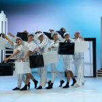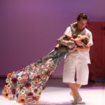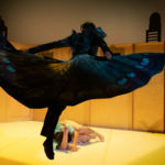 Pour cette deuxième collaboration Emilie voulait que je travaille les costumes dans un esprit de constructions papier. J’ai donc fait plusieurs recherches de matières et de coupes pour essayer de traduire cette matière. Au final c’est en mixant des coupes qui évoquent l’origami et le choix de patines qui appuient volontairement un geste de dessin et de peinture que j’ai transcrit ce monde pop-up de la scénographie.